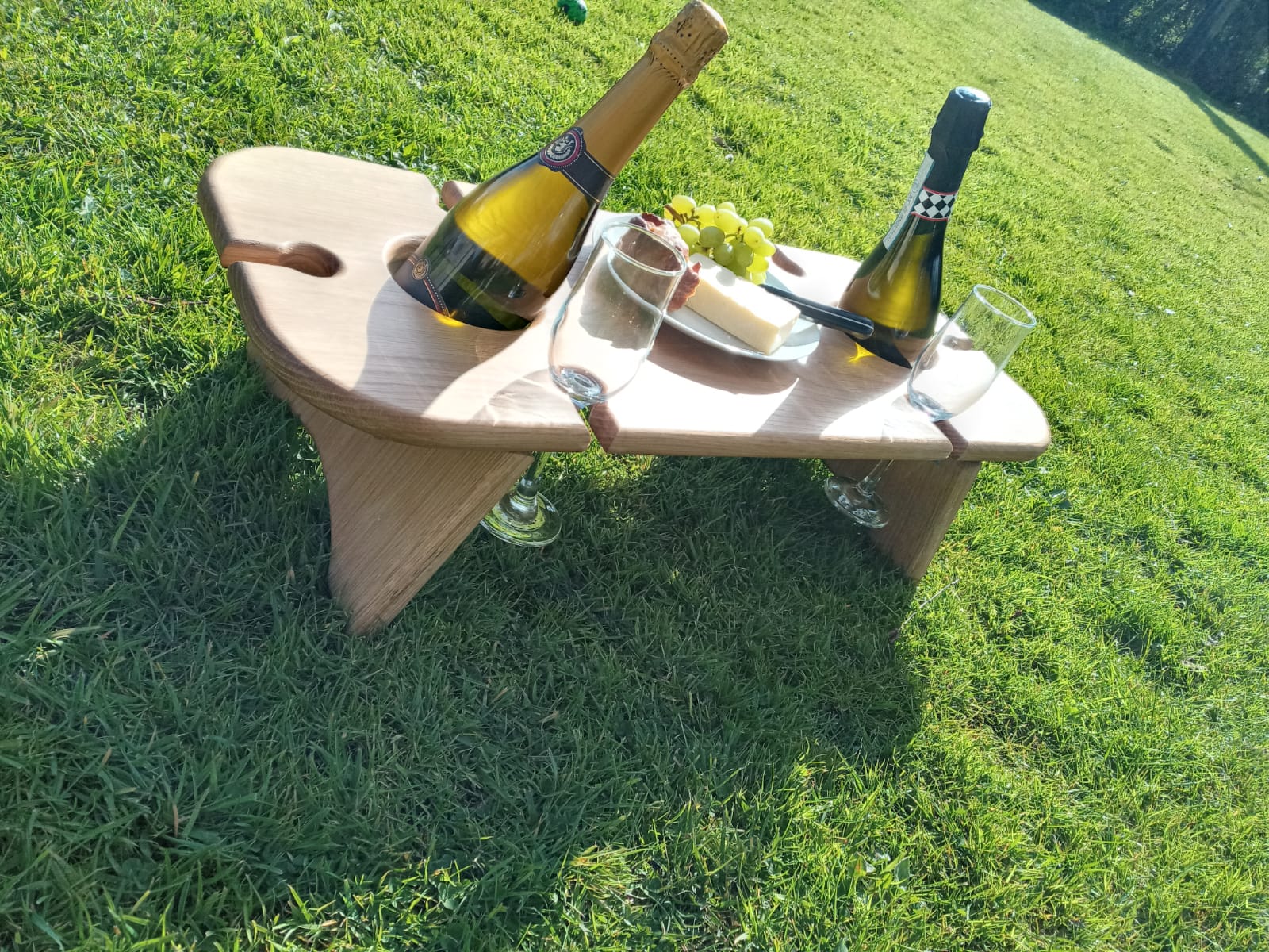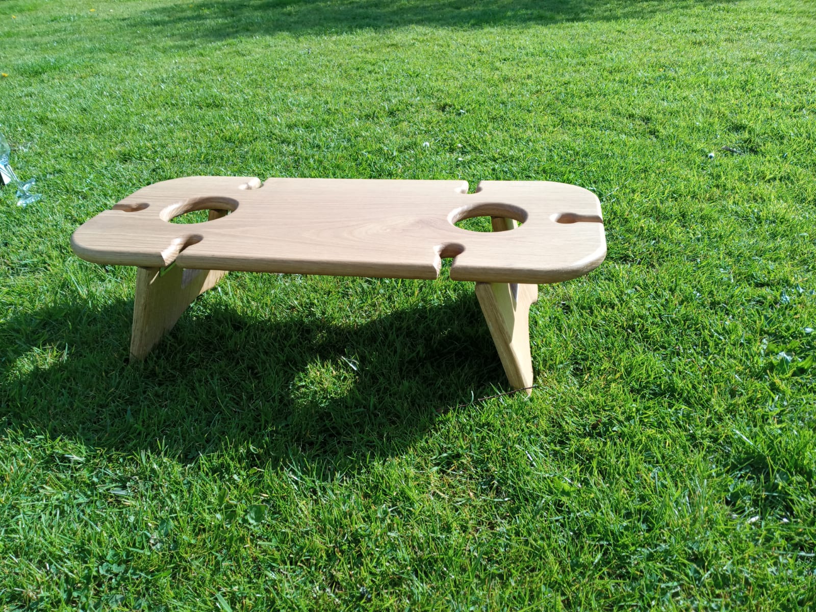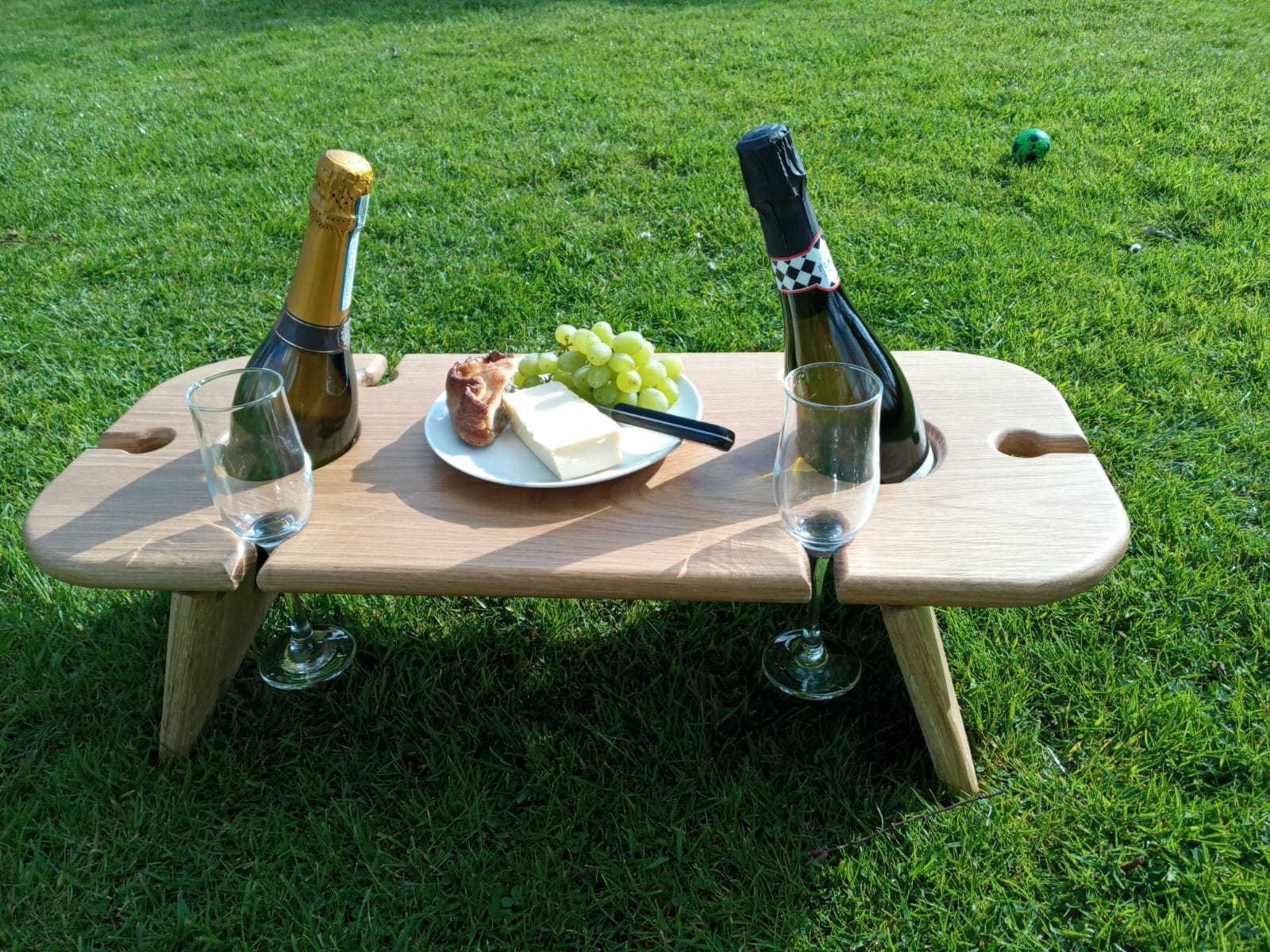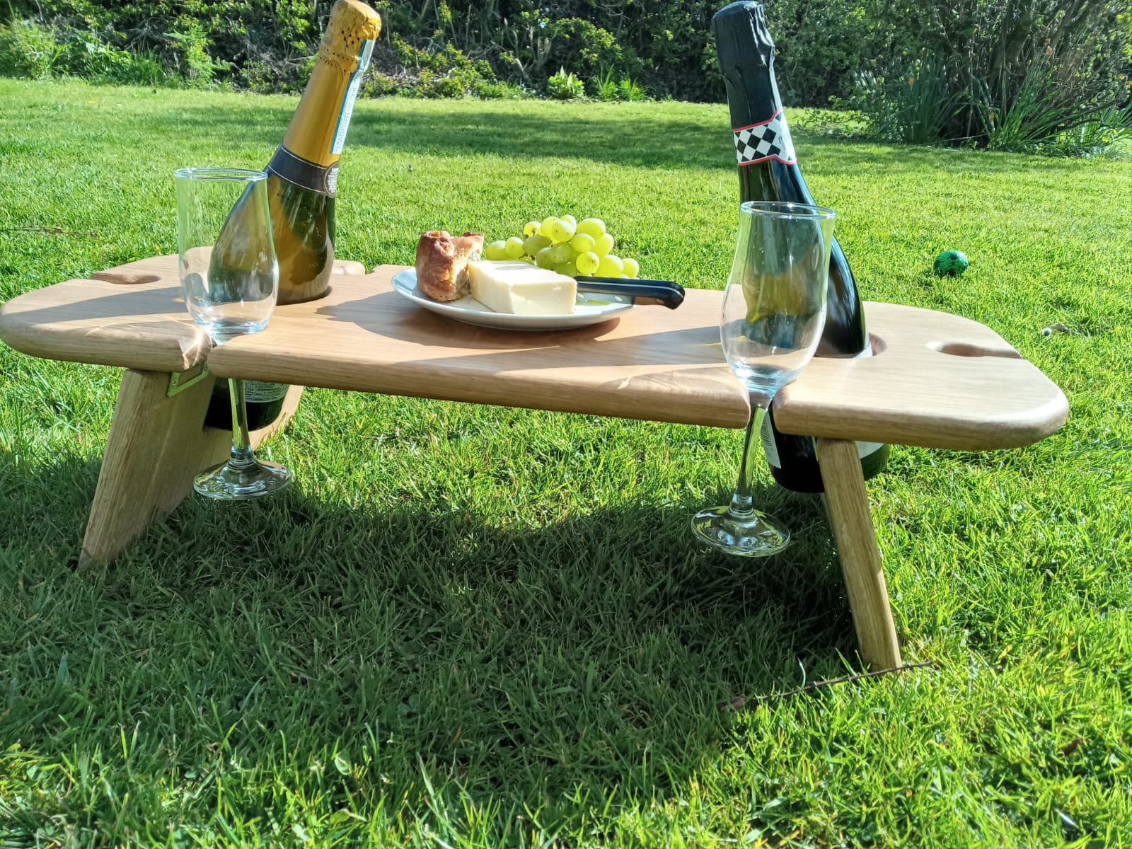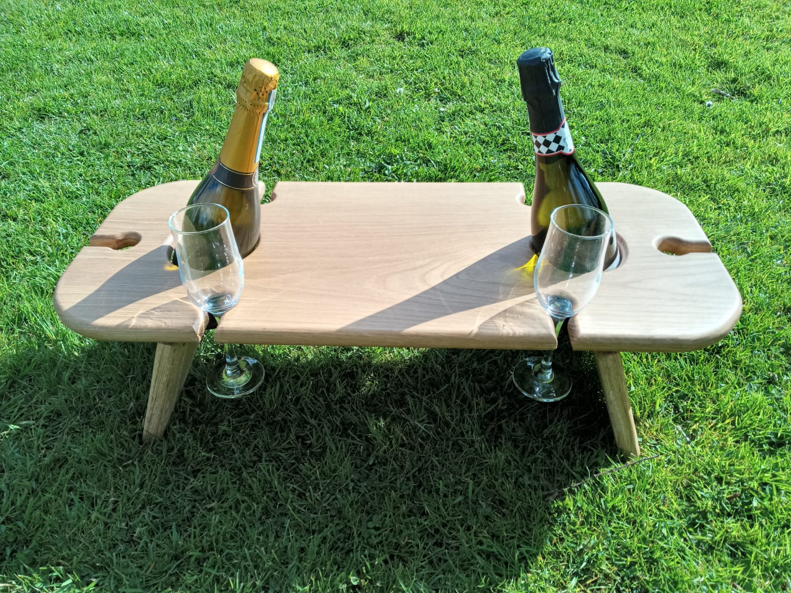 Hand crafted bespoke, portable picnic tables. Quality picnic tables available in kiln dried Pine or Oak, made to order. Put in the back of your car. Ideal for picnics or taking to the beach. Use as a centre piece on a large table, in your caravan or horsebox. Legs fold up making carrying and storage easy. You can choose one bottle or two, number of glass holders, square or round edges.