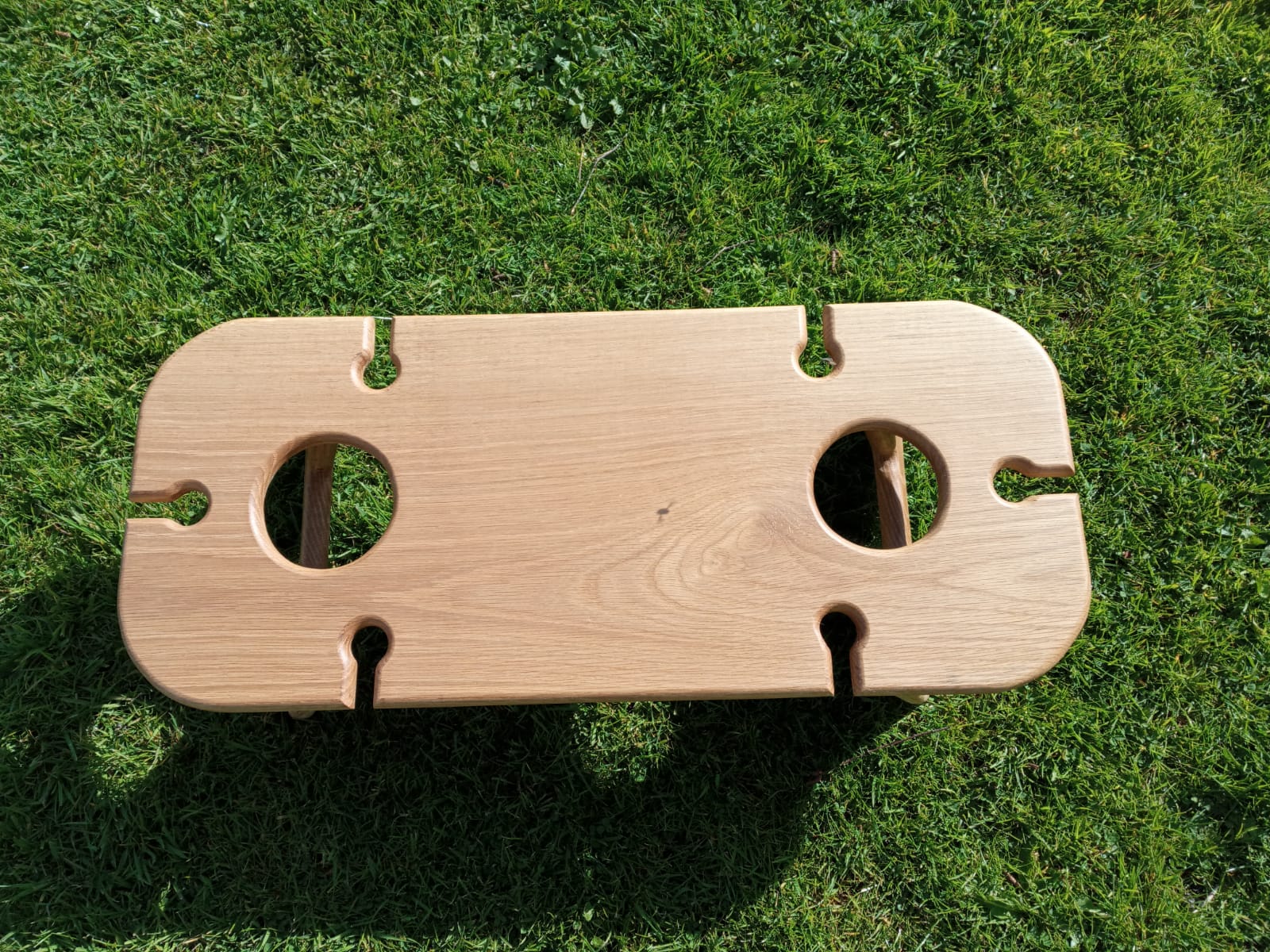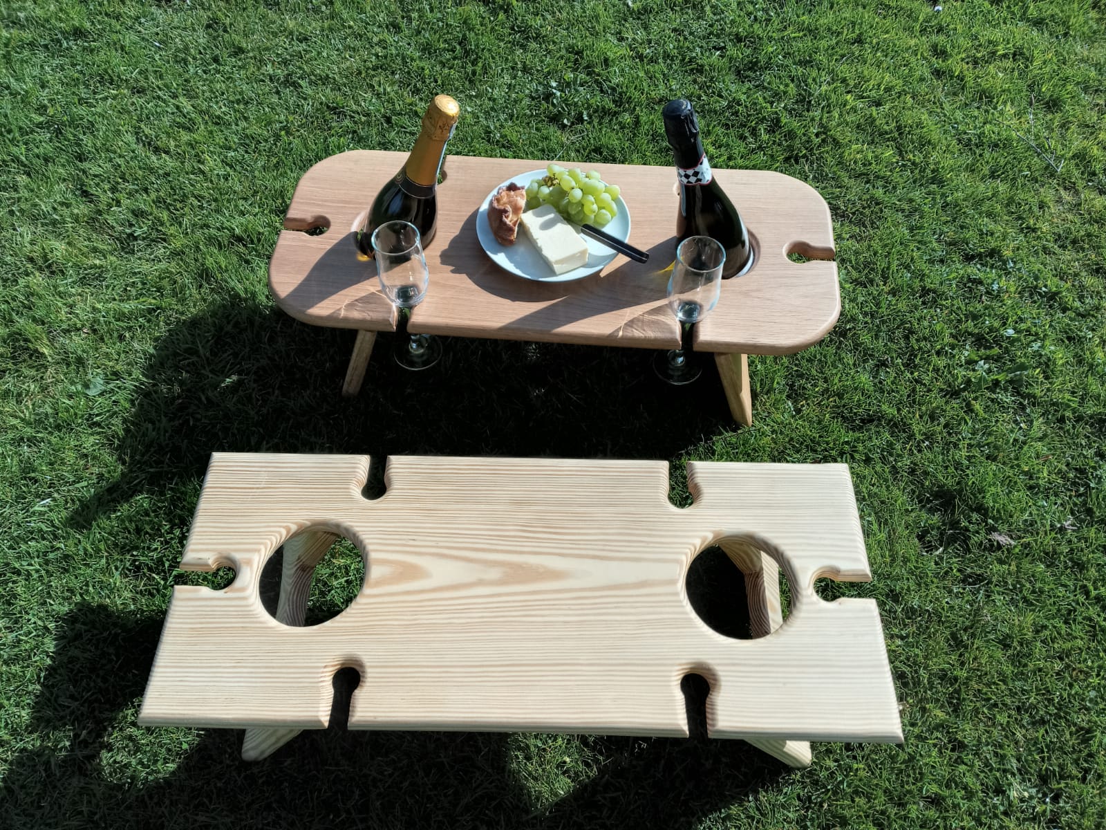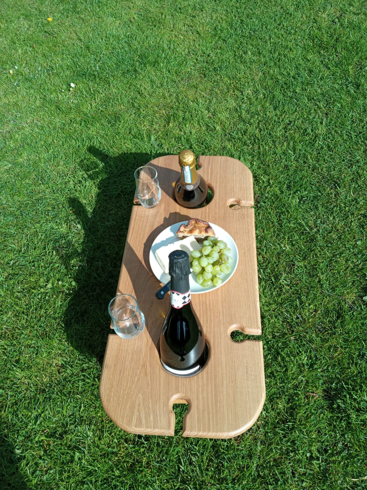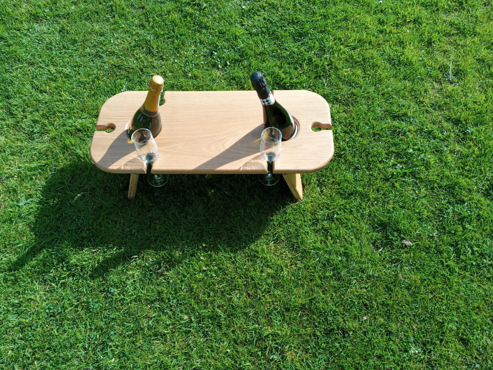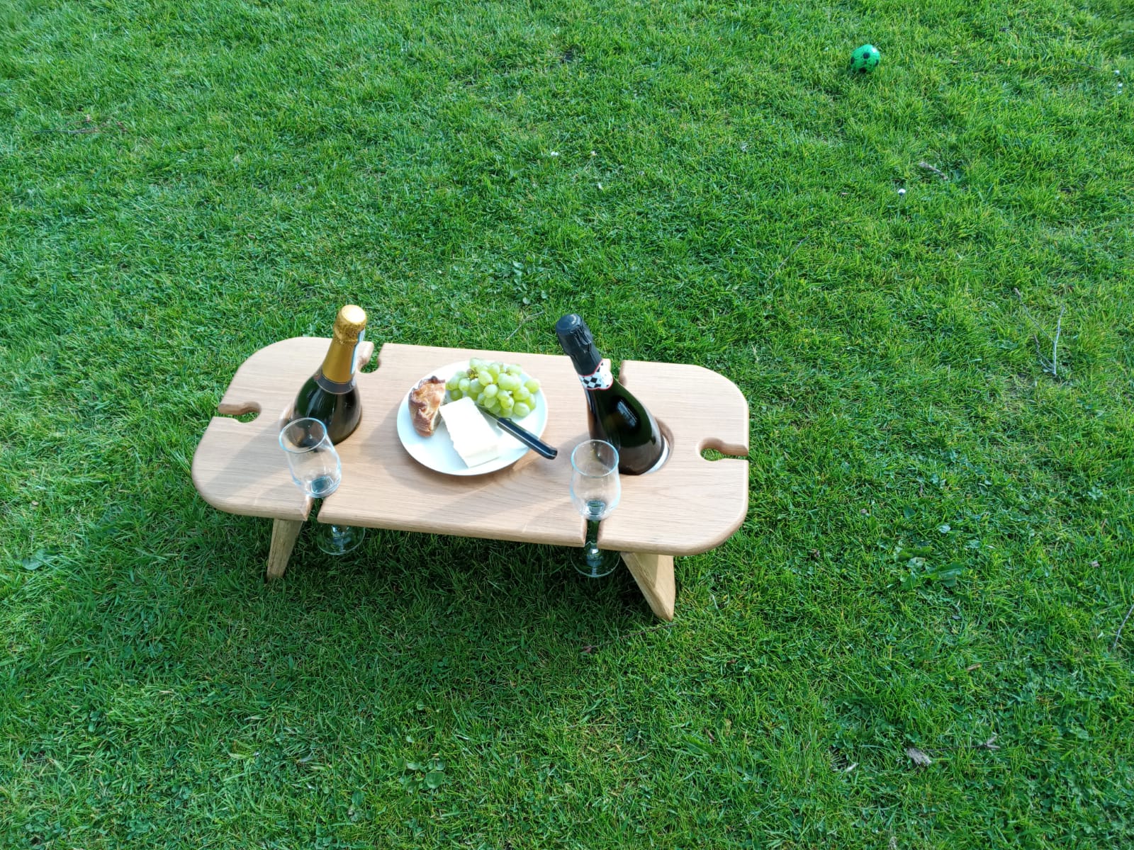 Hand crafted bespoke, portable picnic tables. Quality picnic tables available in kiln dried Pine or Oak, made to order. Put in the back of your car. Ideal for picnics or taking to the beach. Use as a centre piece on a large table, in your caravan or horsebox. Legs fold up making carrying and storage easy. You can choose one bottle or two, number of glass holders, square or round edges.